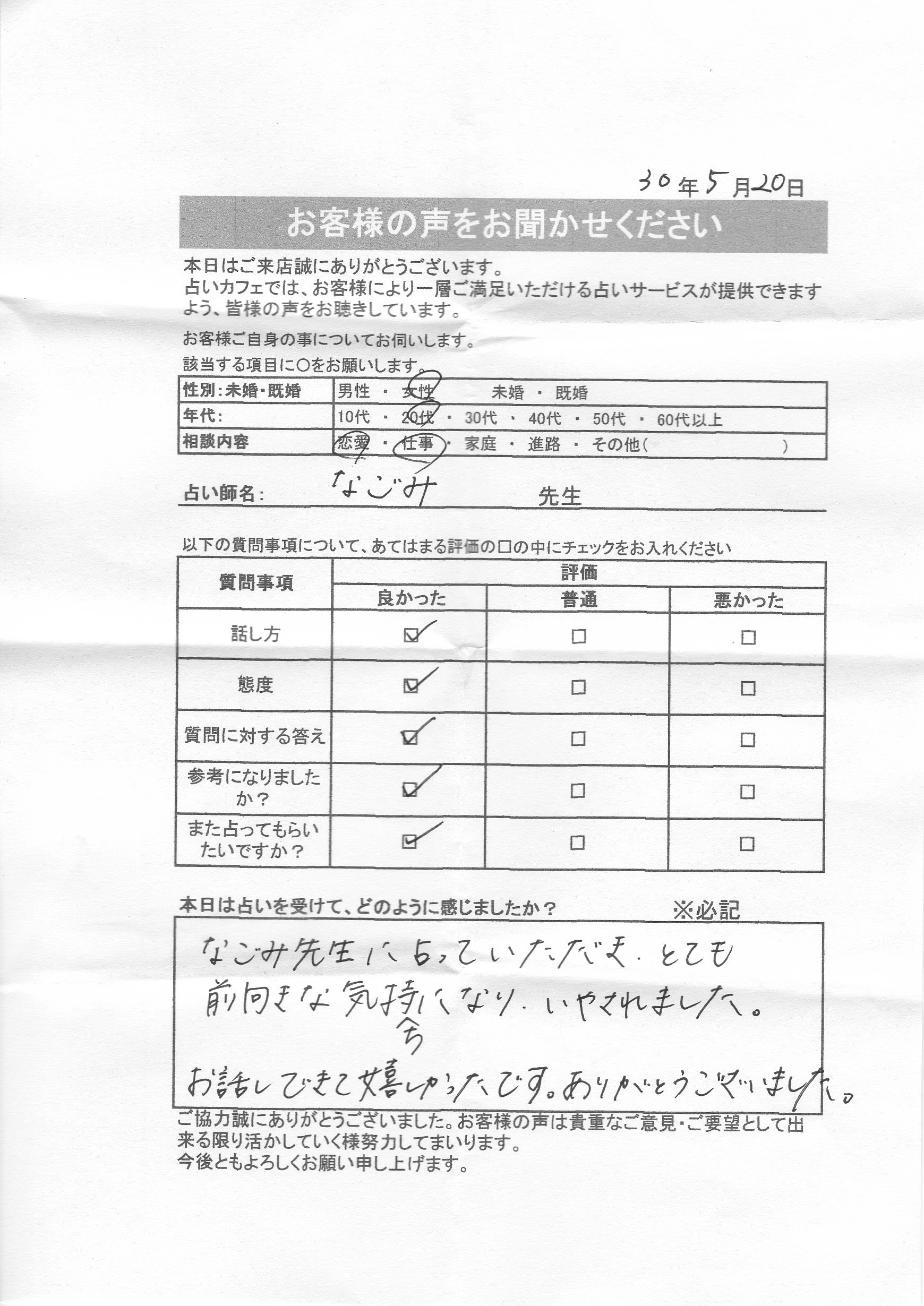 辛くて歩くのが精一杯な状態で、藁にもすがる思いで急に思い立ち、鑑定して頂きました。 暖かく、やさしくすごく具体的に鑑定して下さり、本当に元気に帰えることができました。 アドバイス通り、頑張ります!! 本当にありがとうございました。