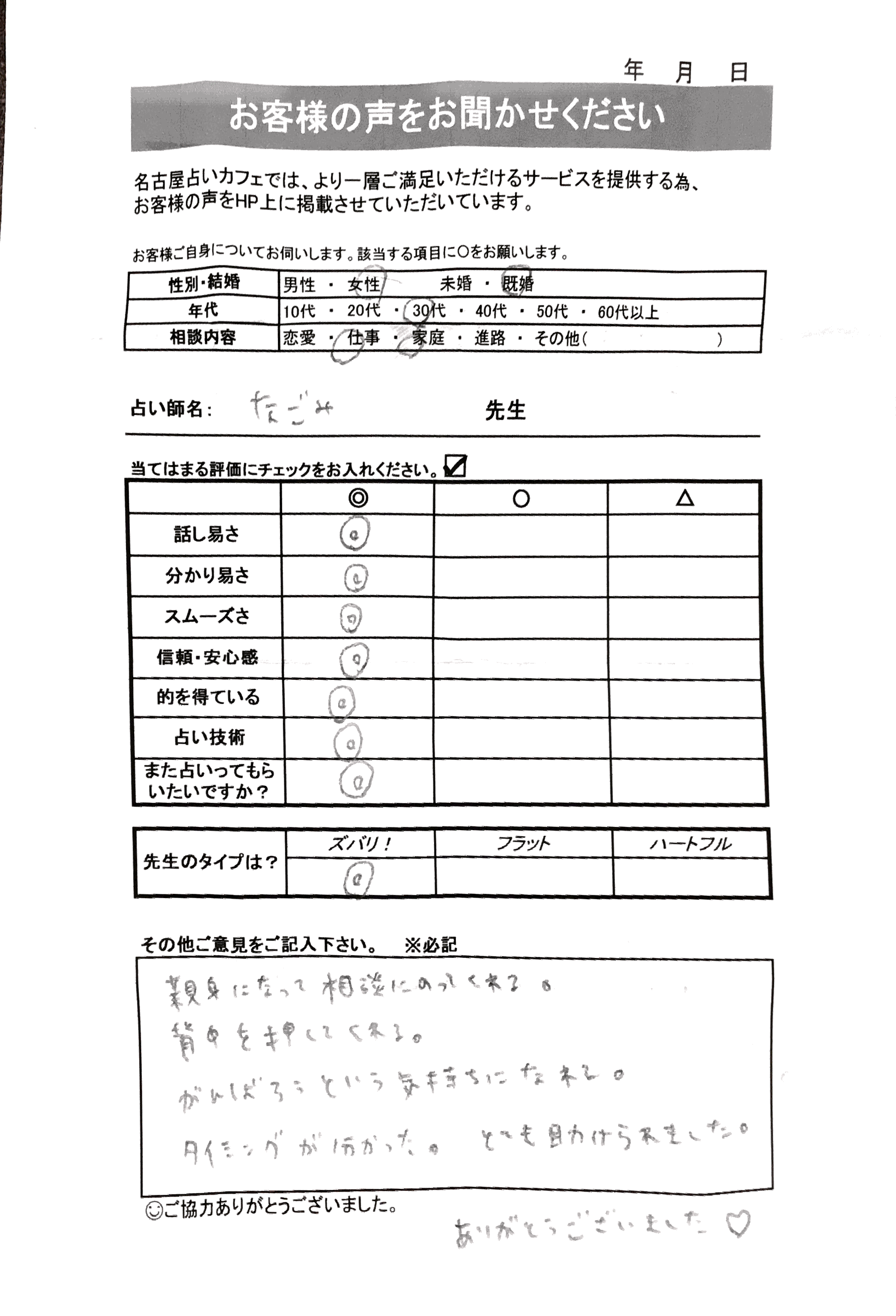 なんでわかるんだろうってくらい当たってました〜! 楽しい時間と幸せにいきてくためのアドバイス、ほんとうにありがとうございました! 和先生は占いもすごいしとっても明るくて話しやすい方でしたよ、オススメです!! またお話ししたいです(≧∀≦)